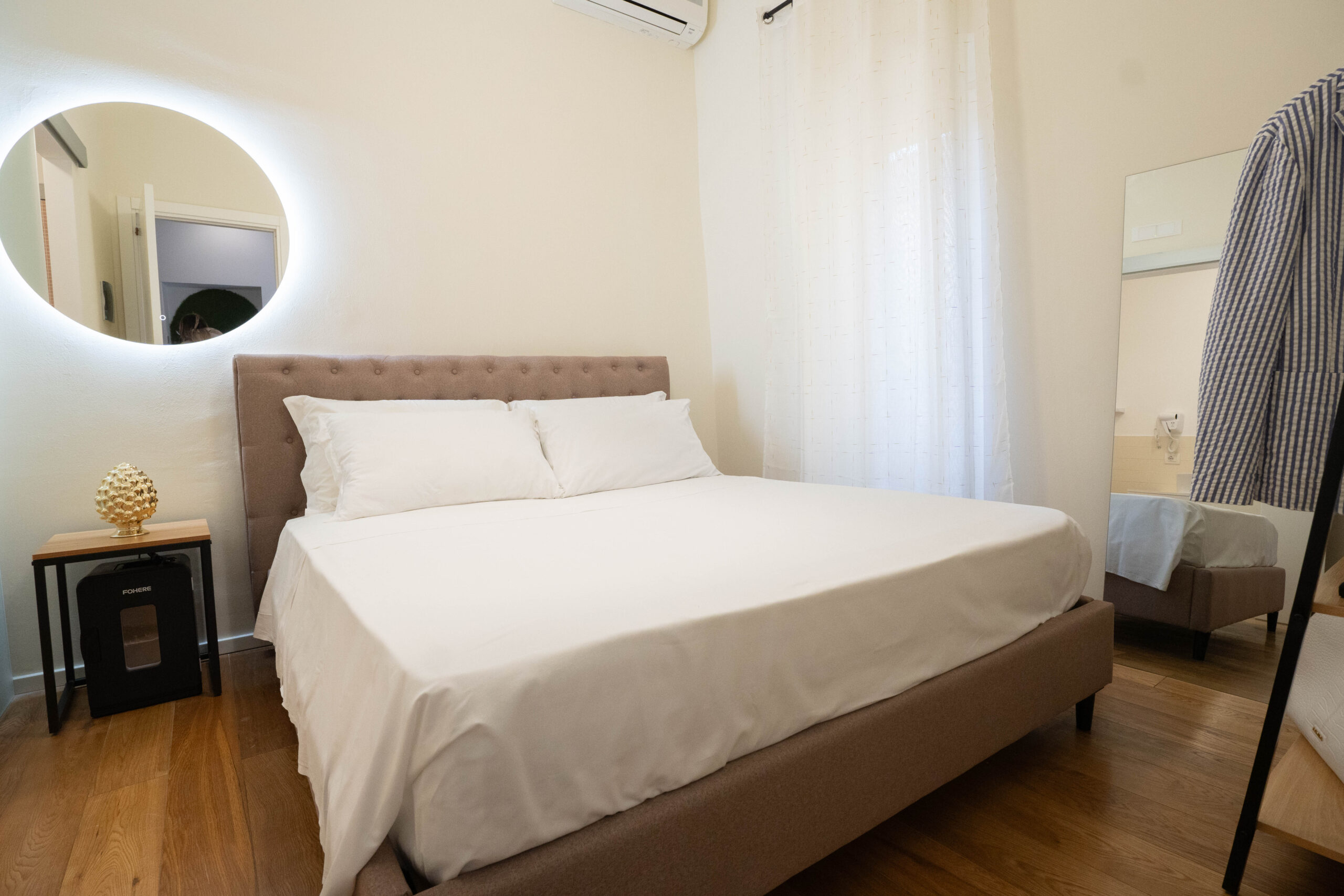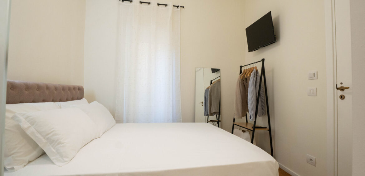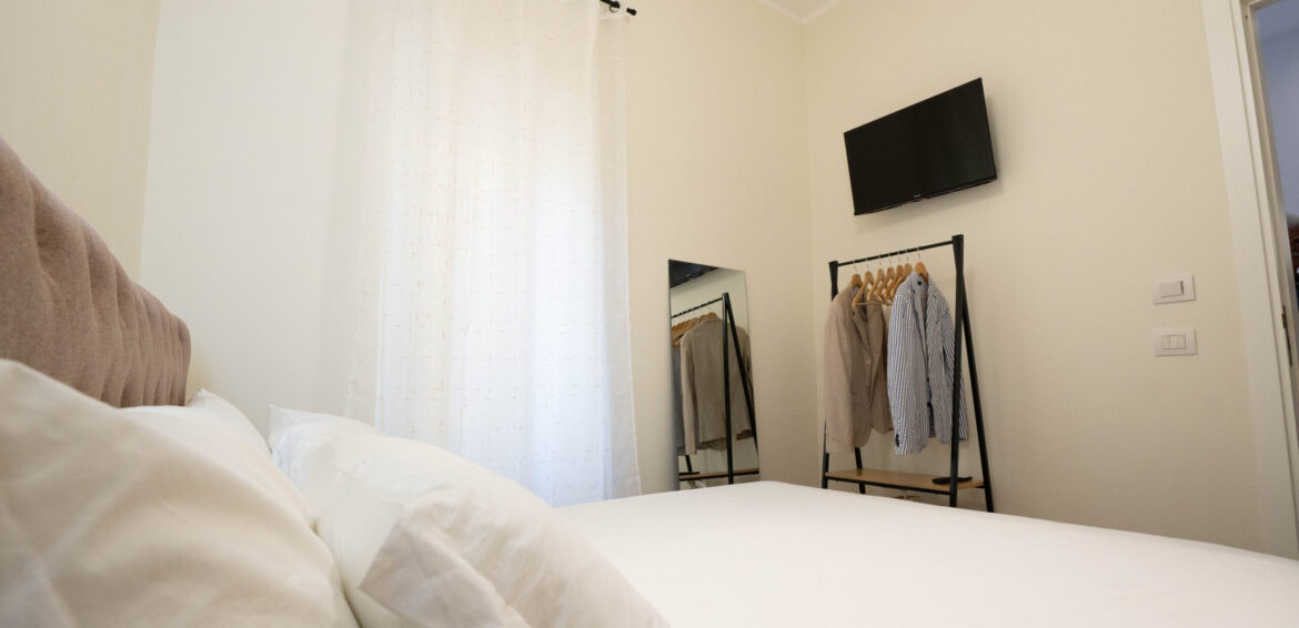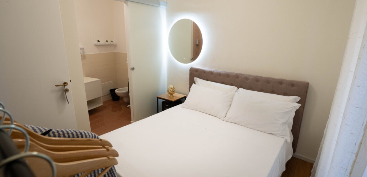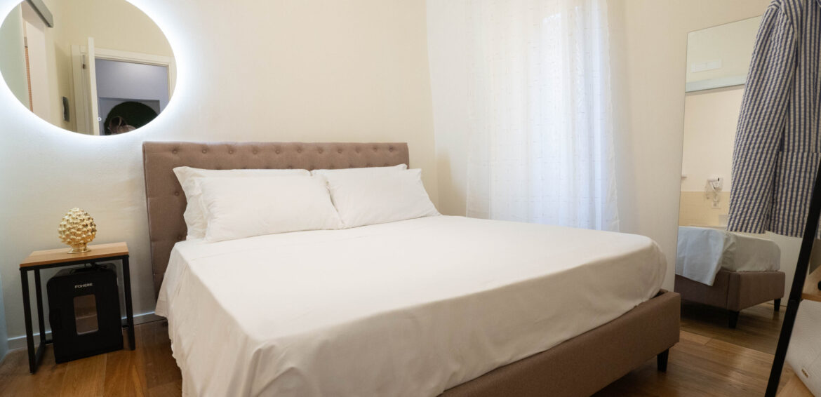 La stanza è arredata in modo elegante e funzionale, con un ampio letto matrimoniale (160cm x 190cm) dotato di biancheria di qualità, cuscini e materasso confortevole. Le pareti in tonalità neutre come il beige e il pavimento in parquet contribuiscono a rendere l’ambiente luminoso e armonioso.