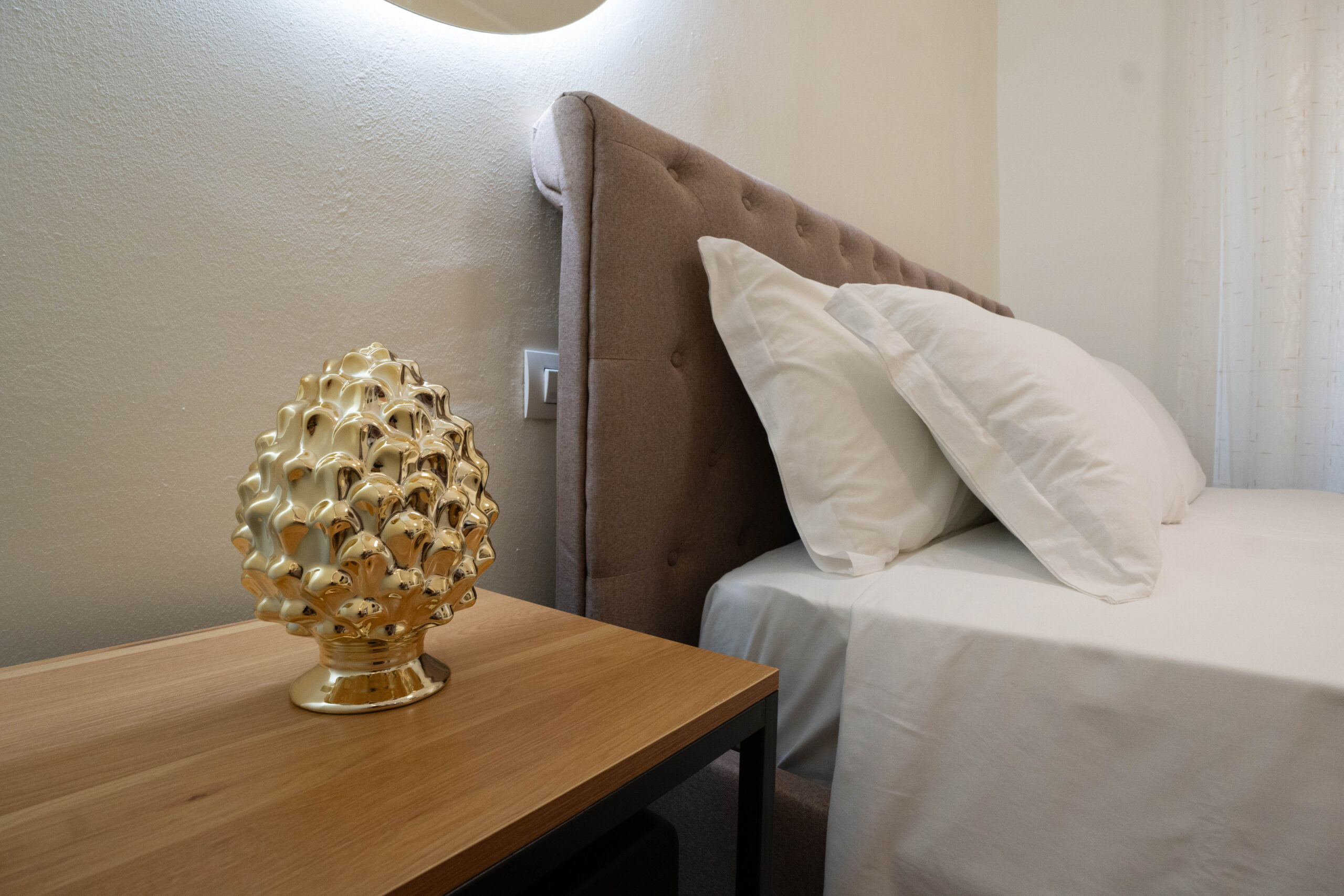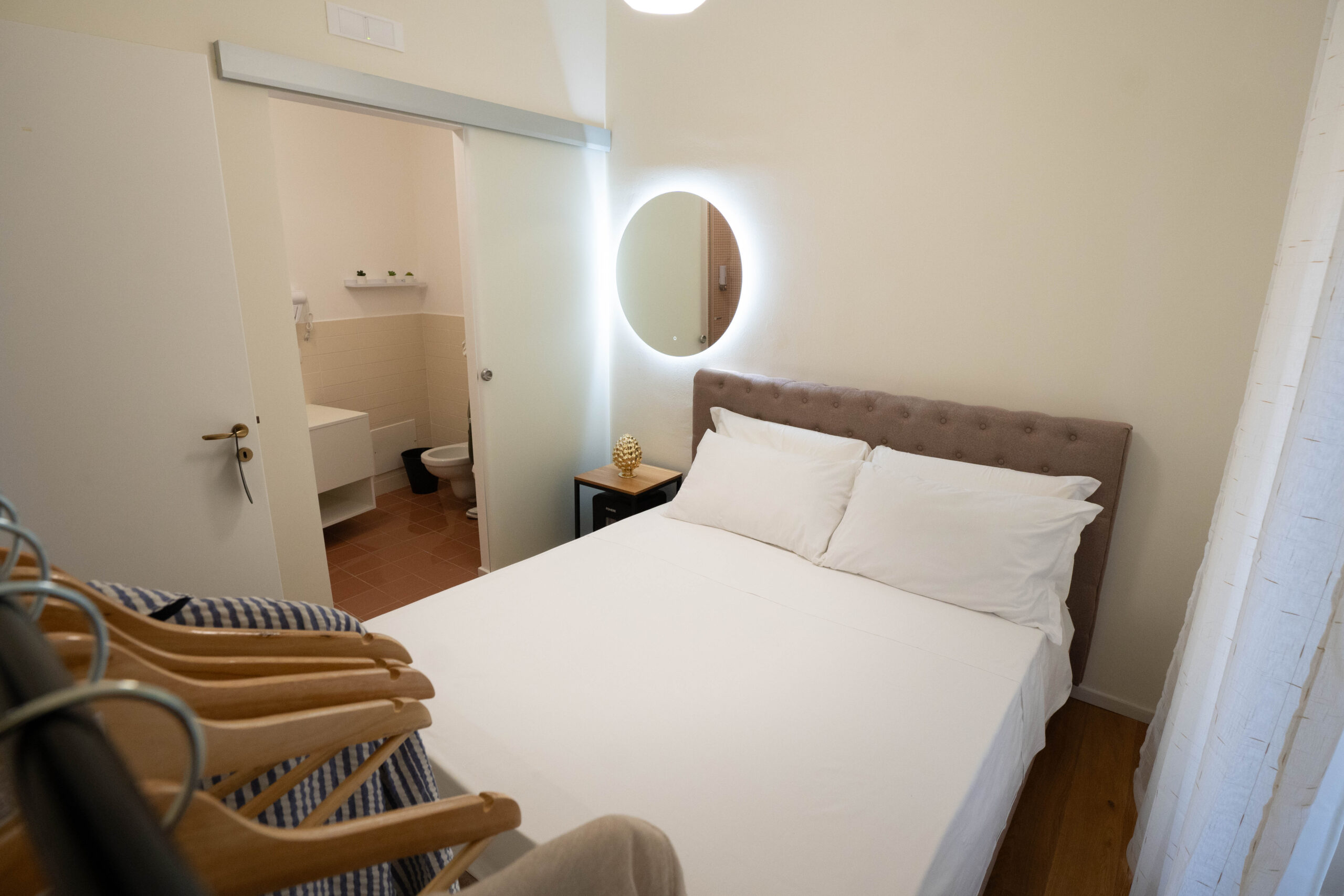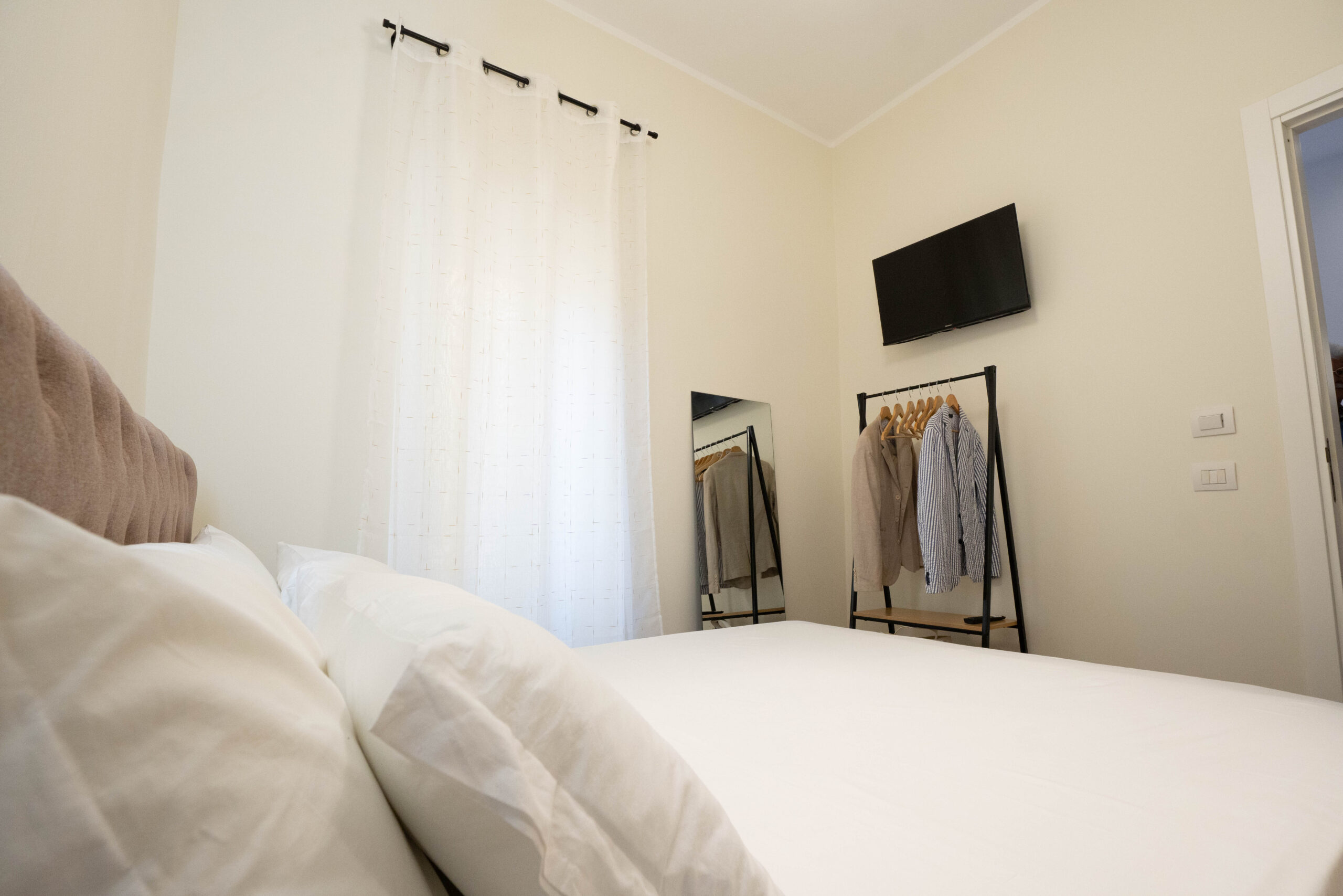 La stanza è arredata in modo elegante e funzionale, con un ampio letto matrimoniale (160cm x 190cm) dotato di biancheria di qualità, cuscini e materasso confortevole. Le pareti in tonalità neutre come il beige e il pavimento in parquet contribuiscono a rendere l’ambiente luminoso e armonioso.