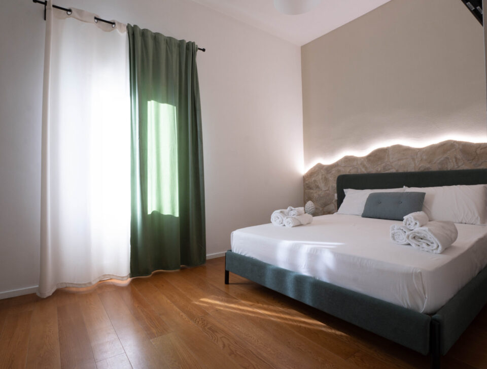 Una camera matrimoniale che combina il fascino delle mura in pietra con un design moderno e confortevole. L'atmosfera calda e ricercata, arricchita da parquet e…