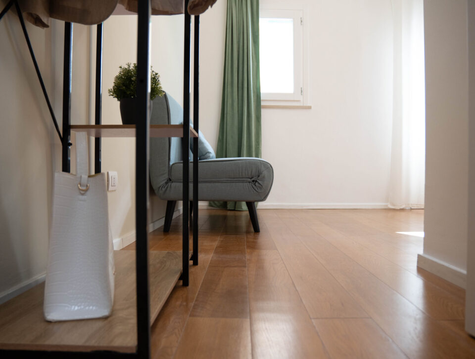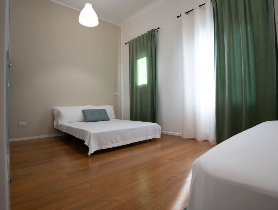 Camera elegante e accogliente con un ampio letto matrimoniale, pavimento in parquet e tonalità neutre. Include un balconcino che si affaccia su una piazza tranquilla,…